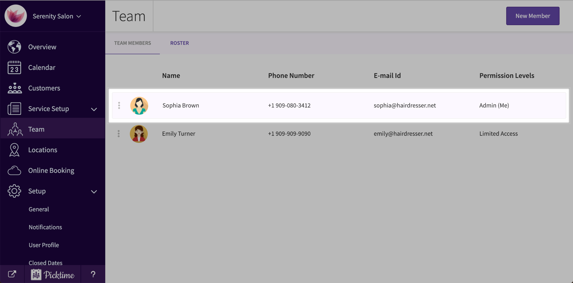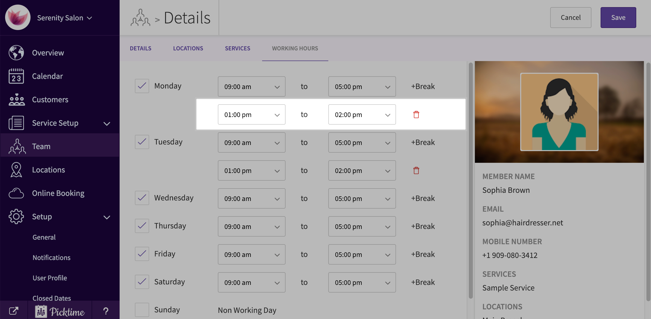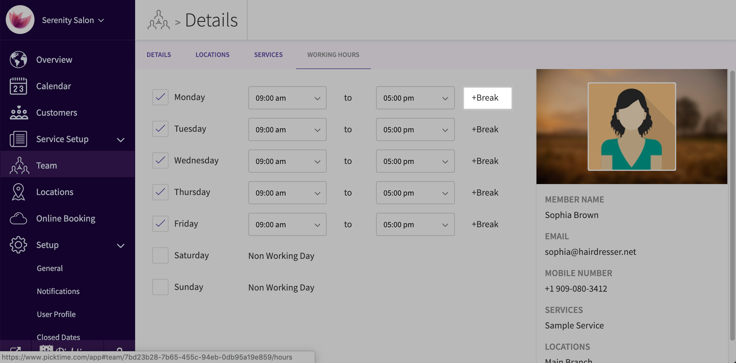 After adding a Team Member to your business account, you can assign working hours to your member. Picktime automatically assigns a standard 9:00 am to 5:00 pm working hours to your team member. Follow the steps below to modify them.