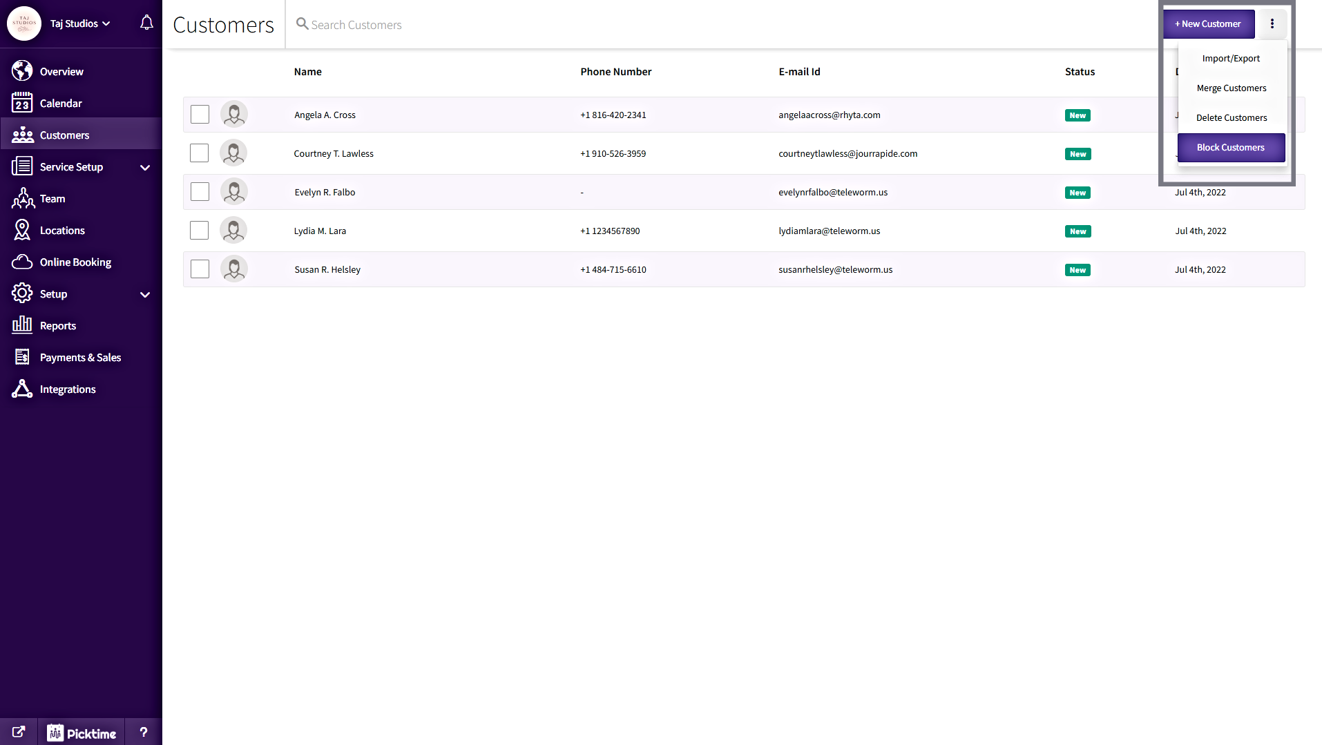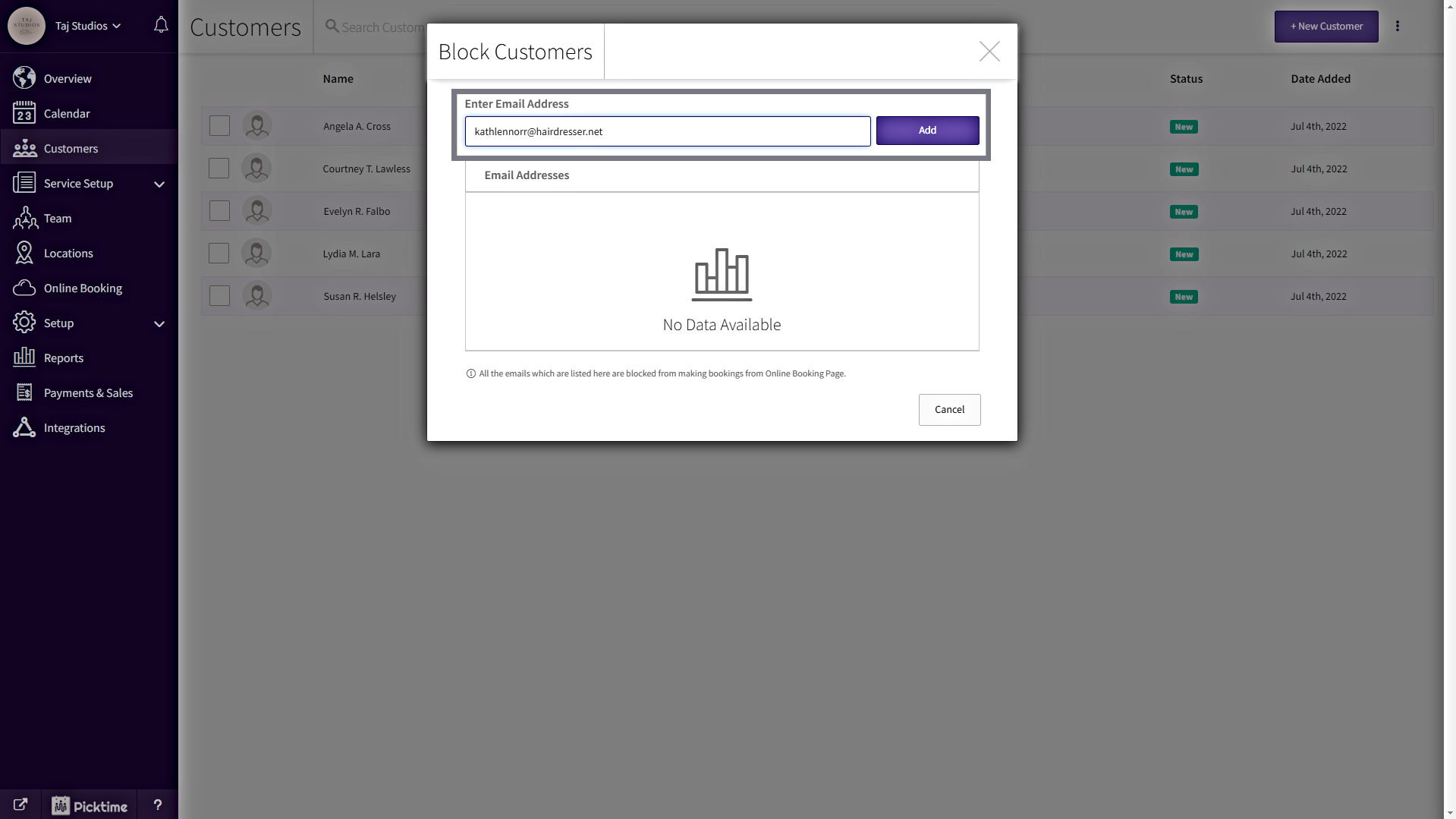 - All the emails which are listed Block Customers list will be blocked from making bookings from your Online Booking Page.