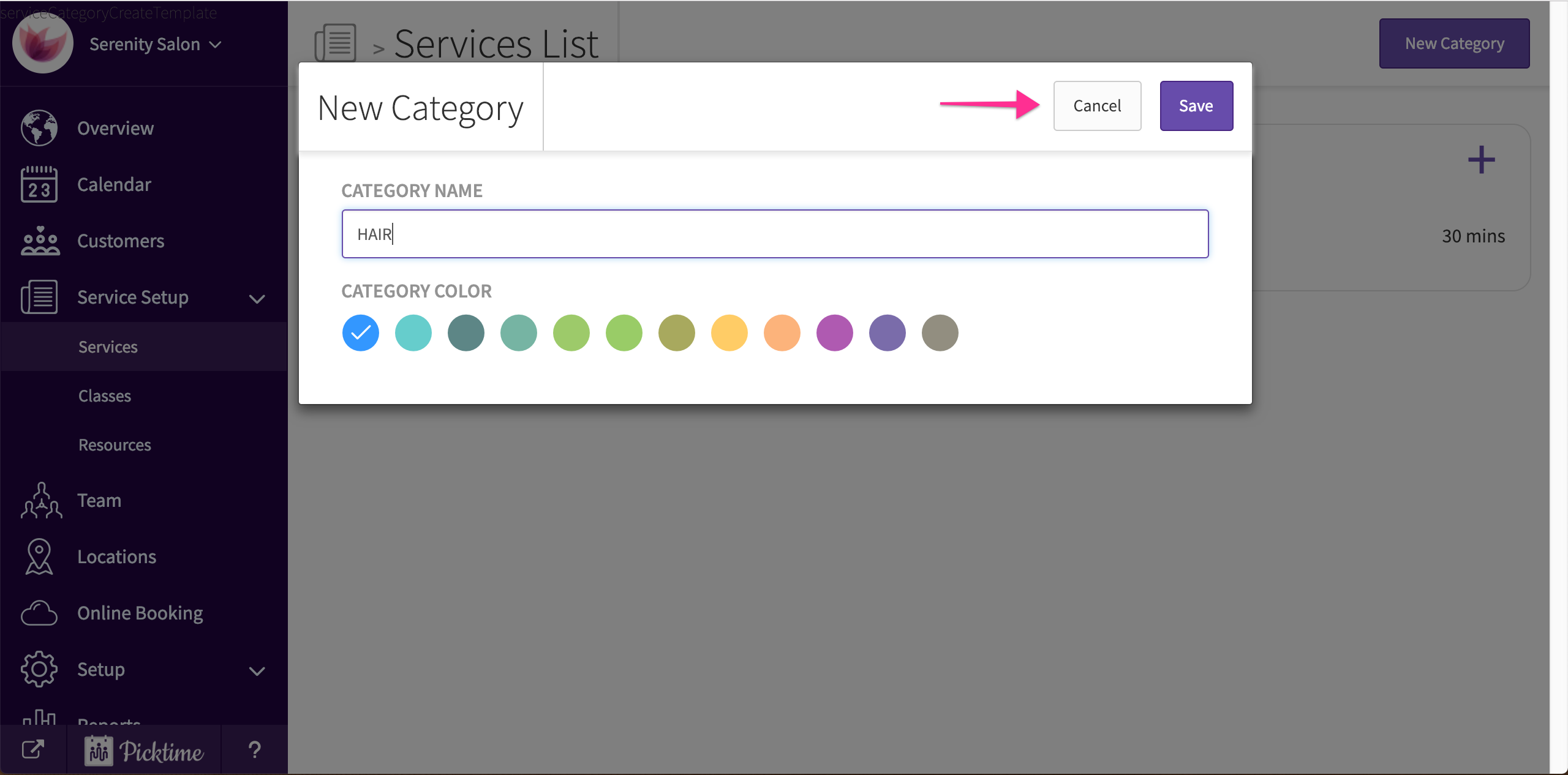 As soon as you create a Picktime account, you will already see an example service and category created. To add more service categories: