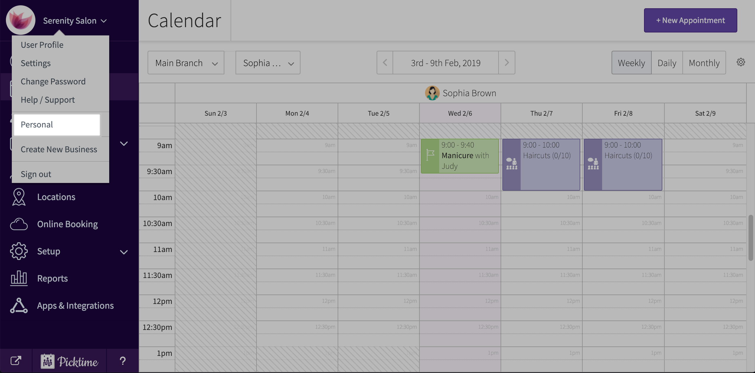 - To open your personal calendar, click on the dropdown you see at the top left corner of your Picktime account. (You will see your business name there).