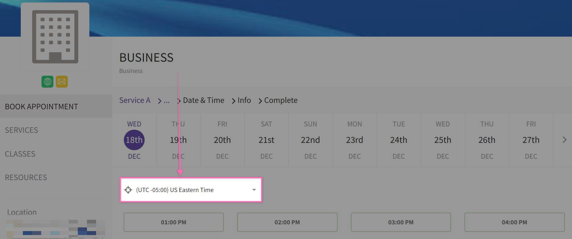 - On the booking page, your Business time zone will be displayed.