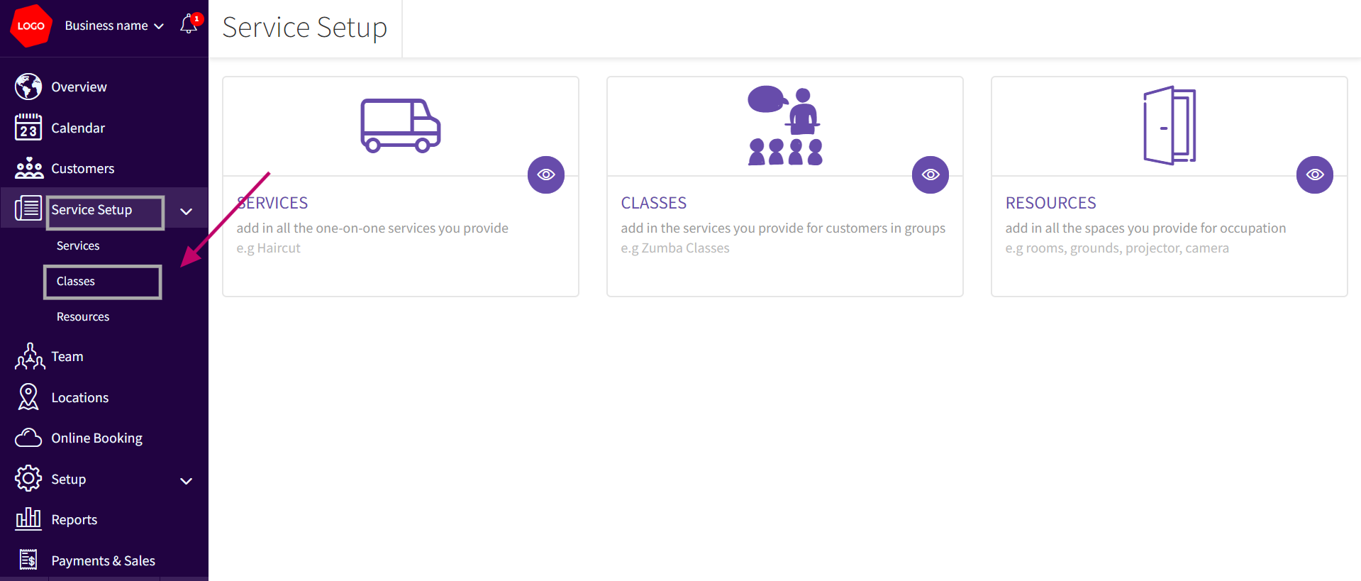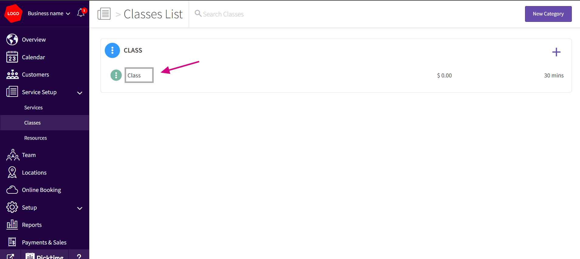 - Navigate to Service Setup> Classes section