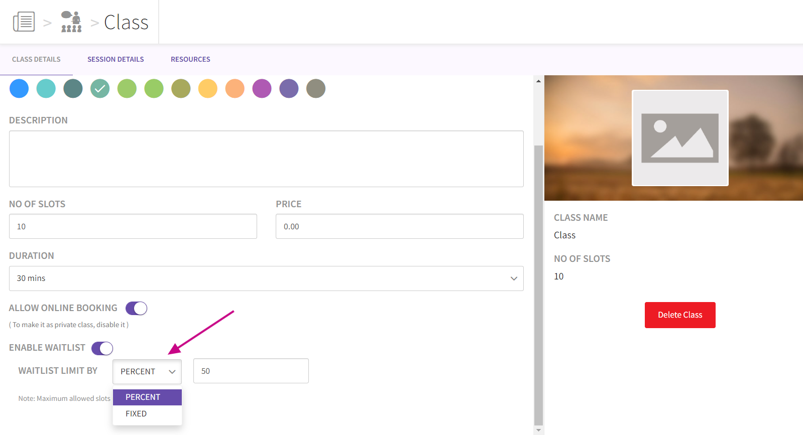 - Once you select the class name you find the Waitlist feature. Enable the feature by toggling the button to the 'On'. After enabling , you can view 2 options and you need to select between Fixed and Percentage Options