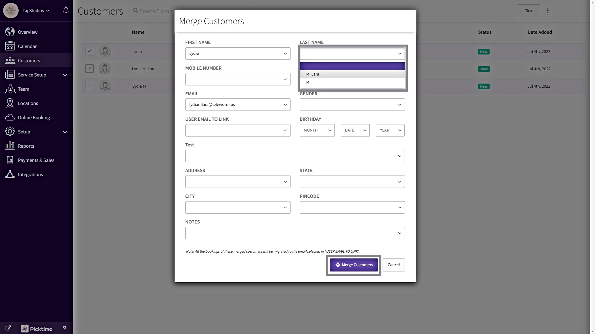 All the bookings of these merged contacts will be migrated to the email address selected in the "USER EMAIL TO LINK" field. Email address will be shown in the "USER EMAIL TO LINK" field only if the secondary email address was already registered with Picktime.