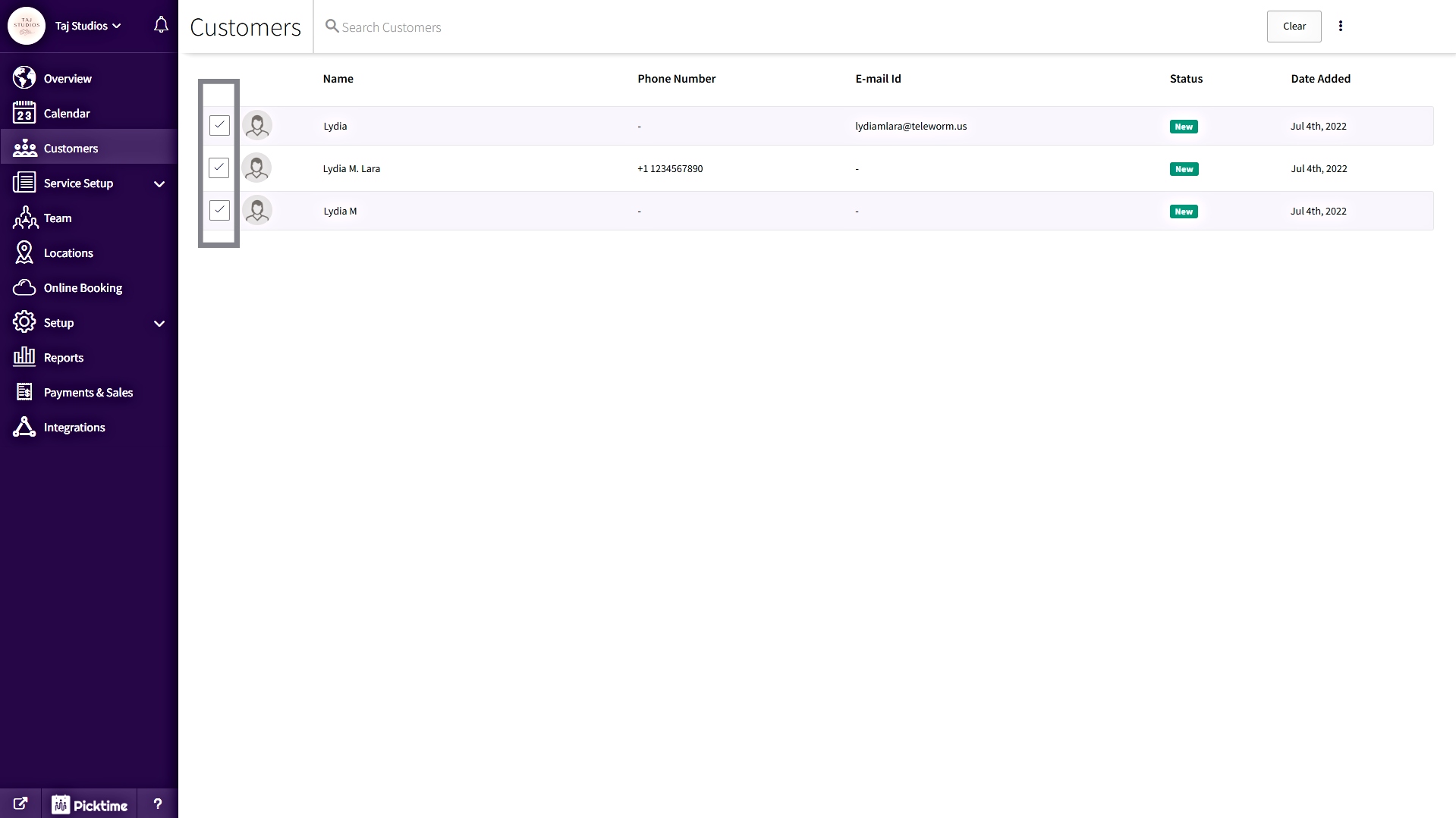 - Go to the Customers tab in the side navigation, and select the checkboxes of the duplicate contacts to merge them.