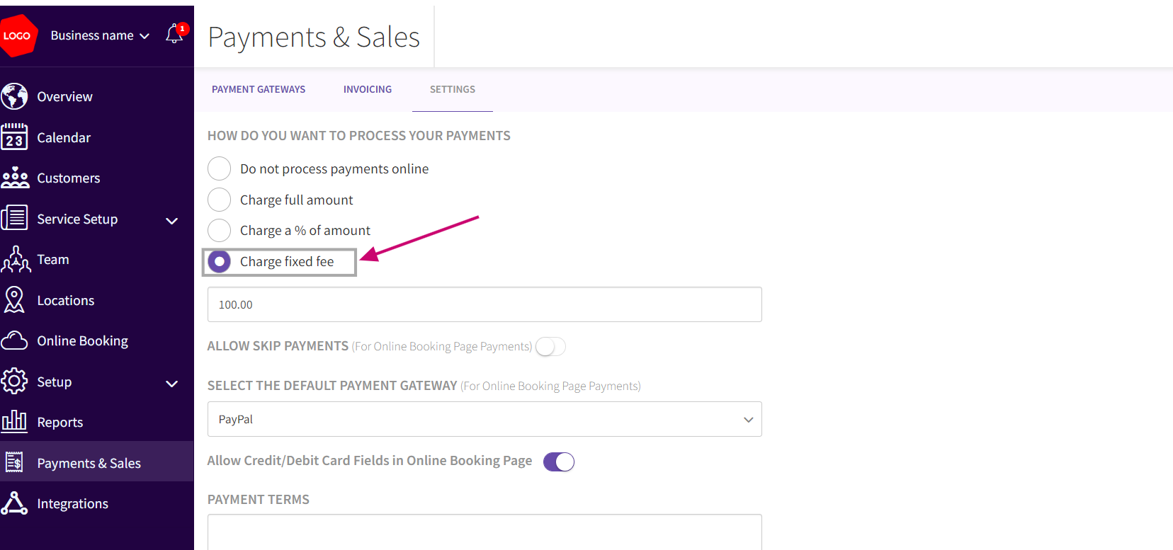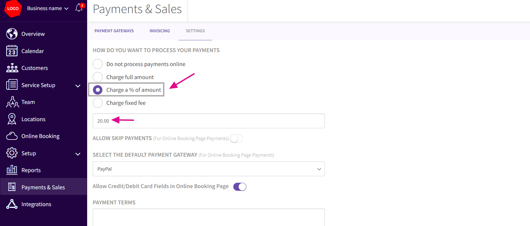 - Under Settings tab : Under How do you want to process your Payments, you can view the options of Choose Fixed Amount or Percentage: Depending on your preference, select either a fixed amount or a percentage of the service fee.