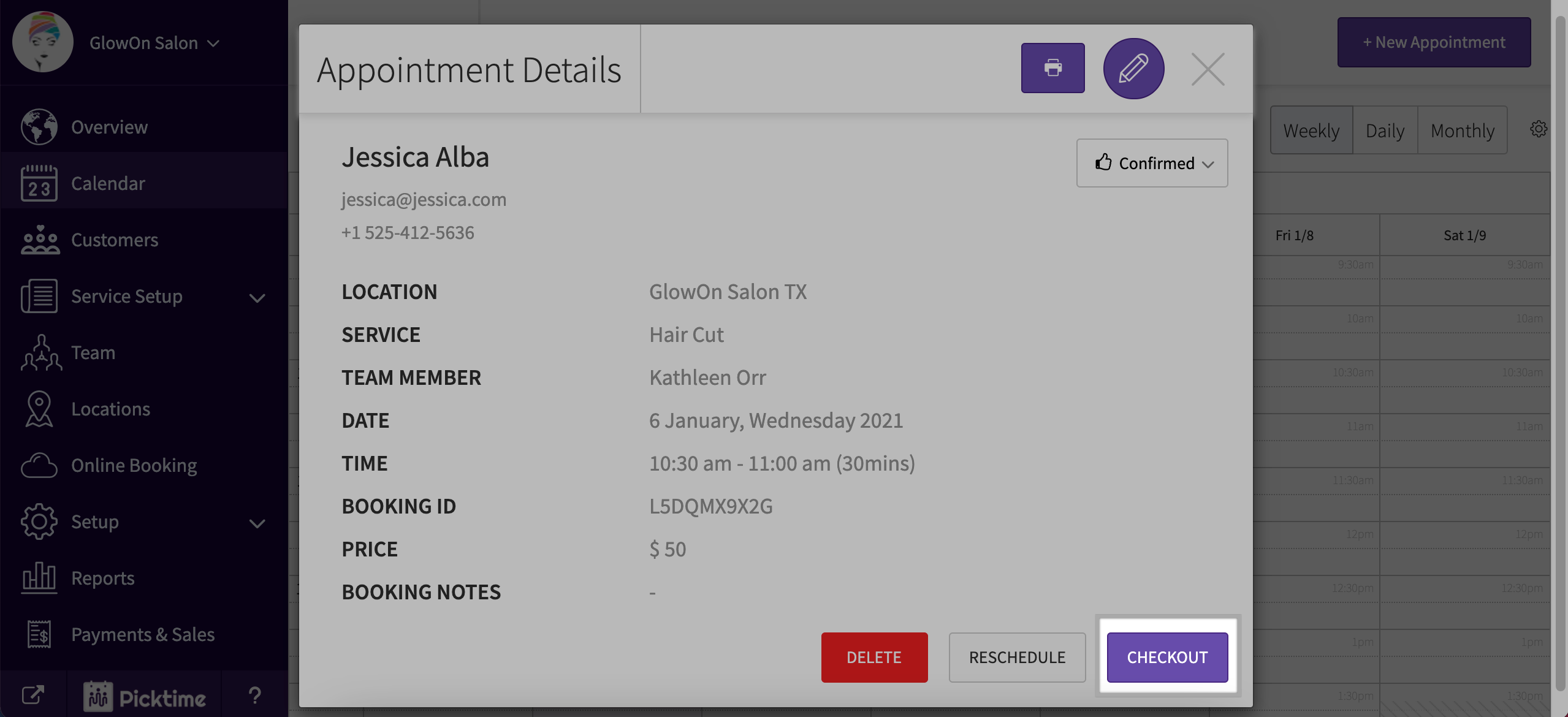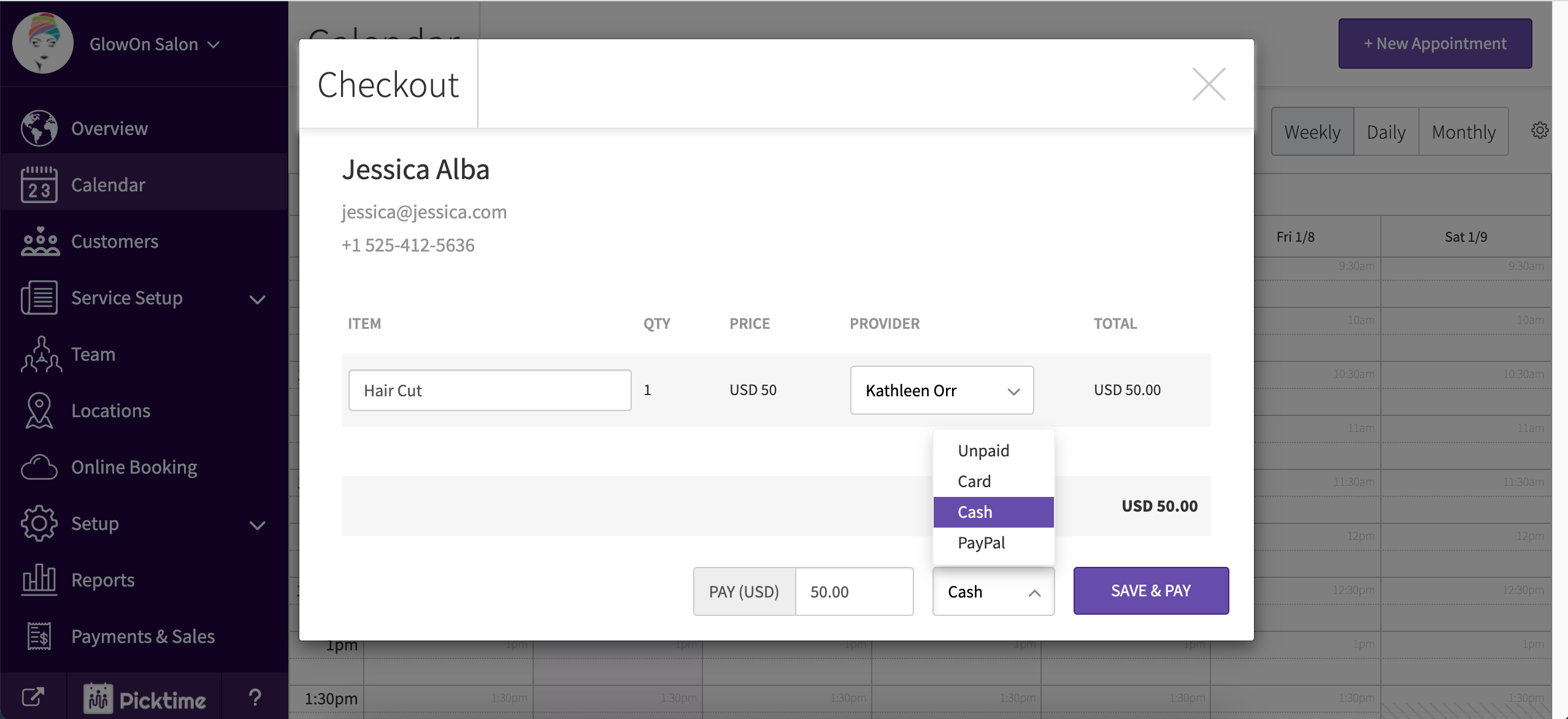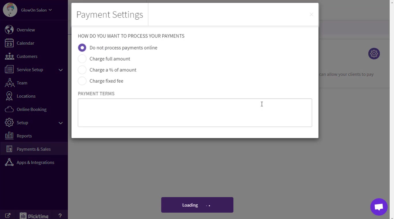 - If you wish to take part payment only, the remaining payment can be processed from the Picktime calendar.