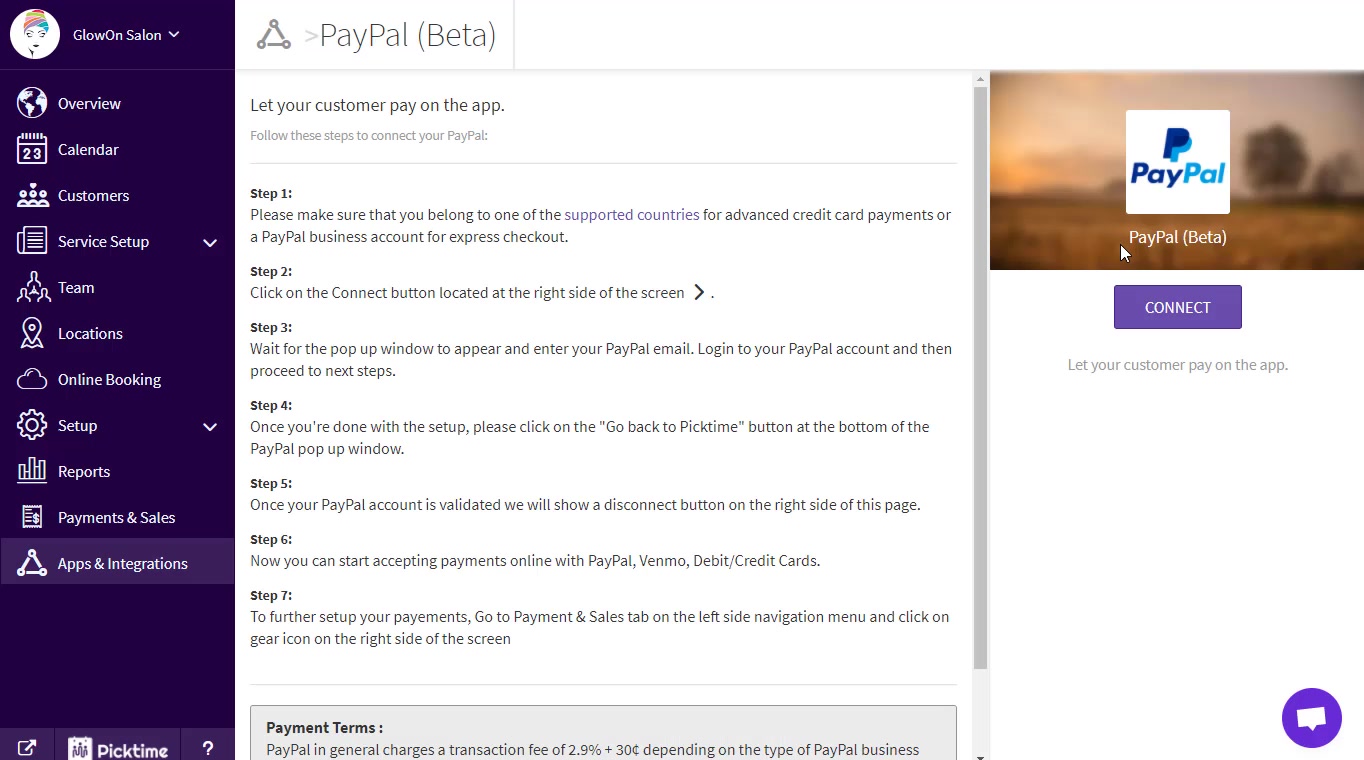 - Go to the 'Apps and Integrations' section and connect with your PayPal Account