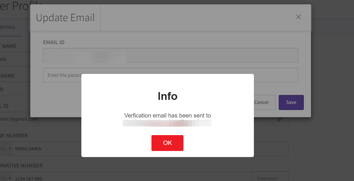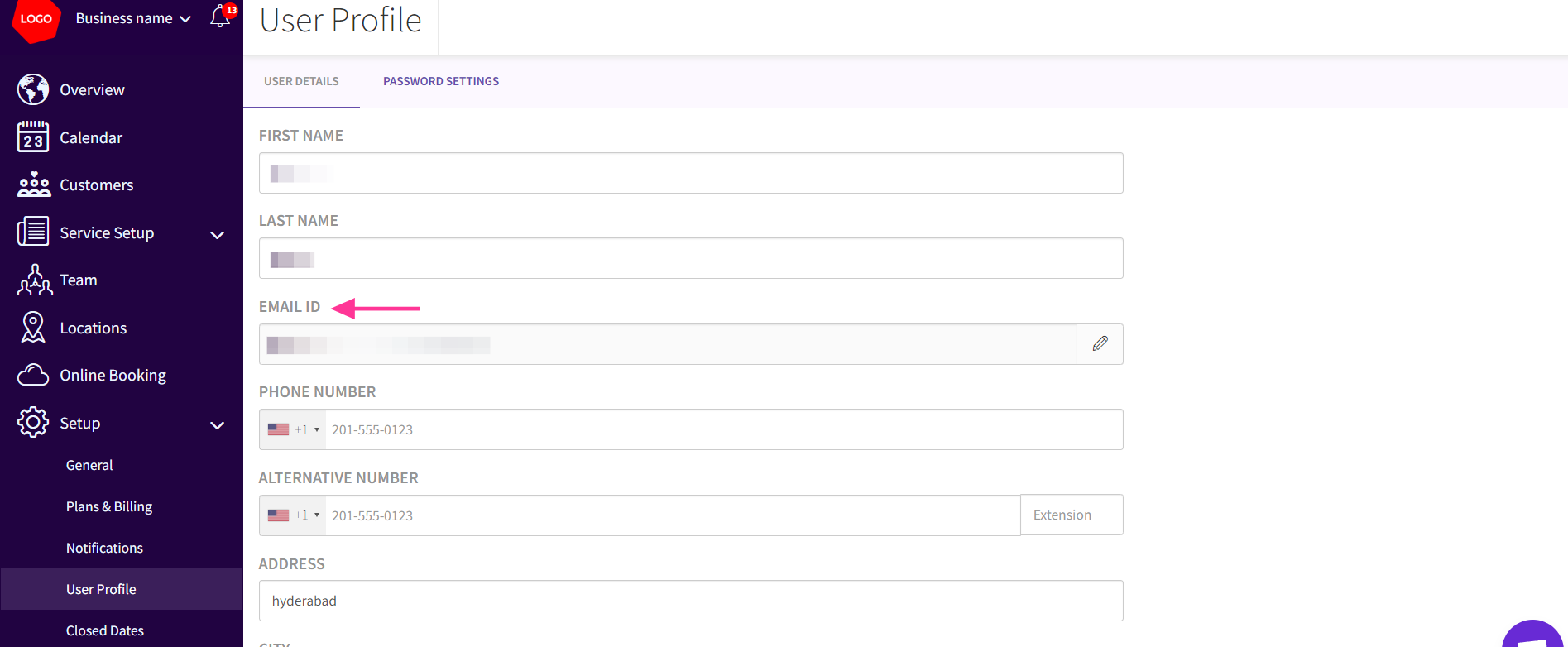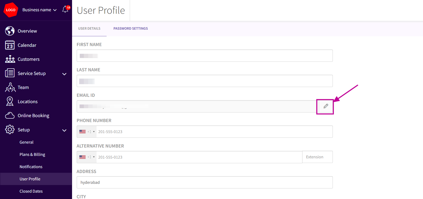 In the EMAIL ID field, input the new email address by clicking Edit option ( pencil icon ) that you want to associate with your business. Ensure that this email is not already registered as an Admin, Team member, or customer in any Picktime business.