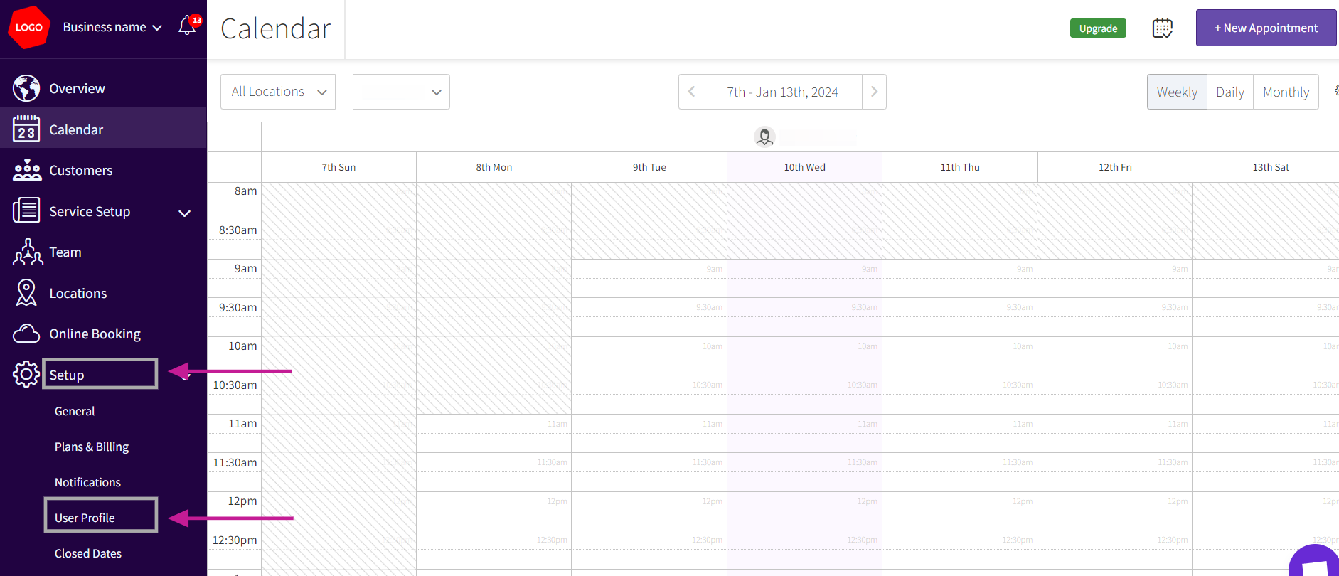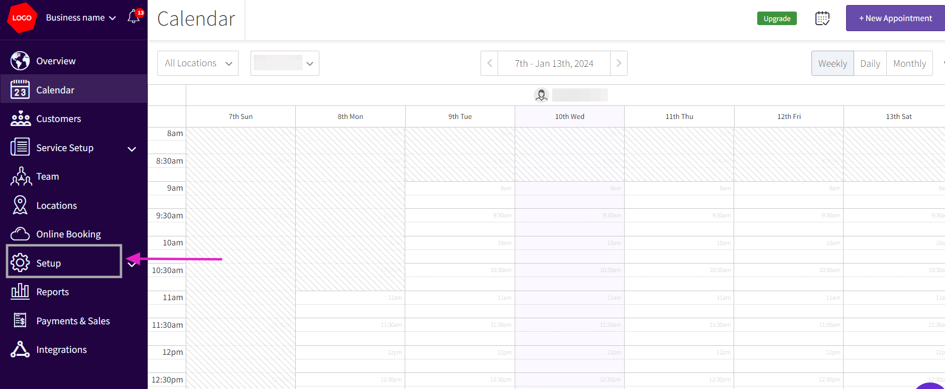 The first step in updating your business email address is to access the Setup section. Log in to your Picktime account and you can locate the Setup menu in the left side navigation.