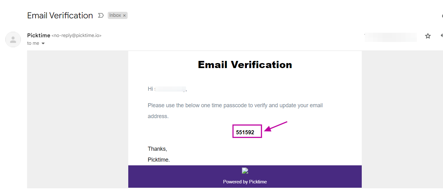 After entering the new email address, Picktime will initiate a verification process. A passcode will be sent to the email address you provided.