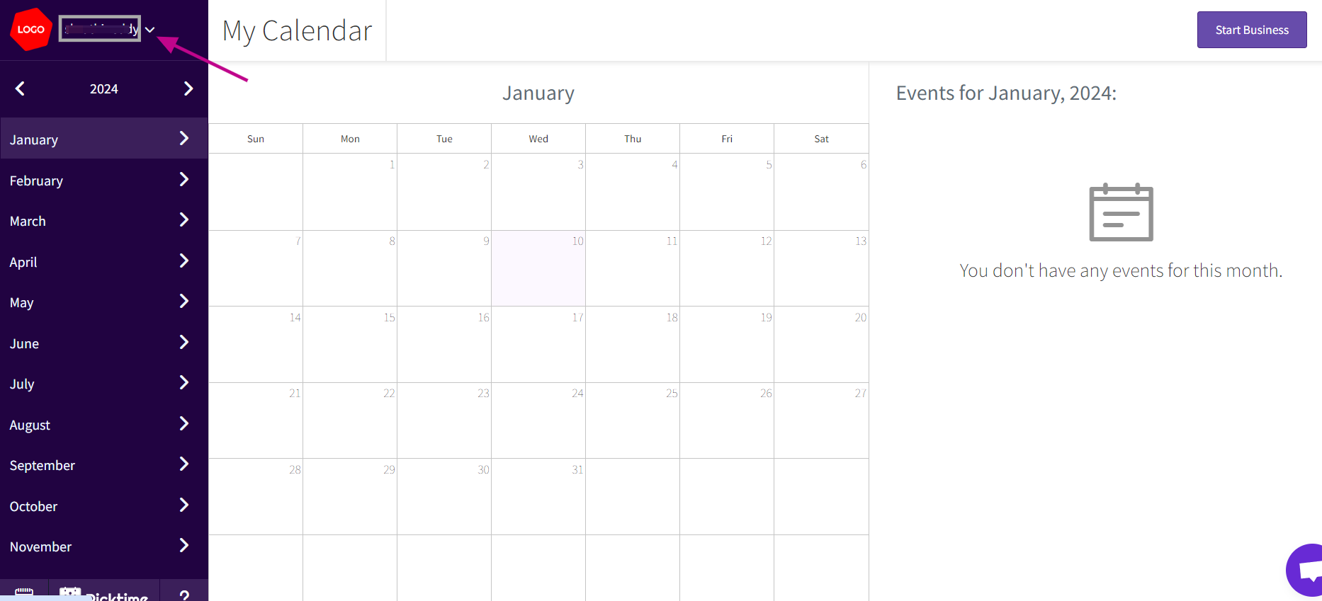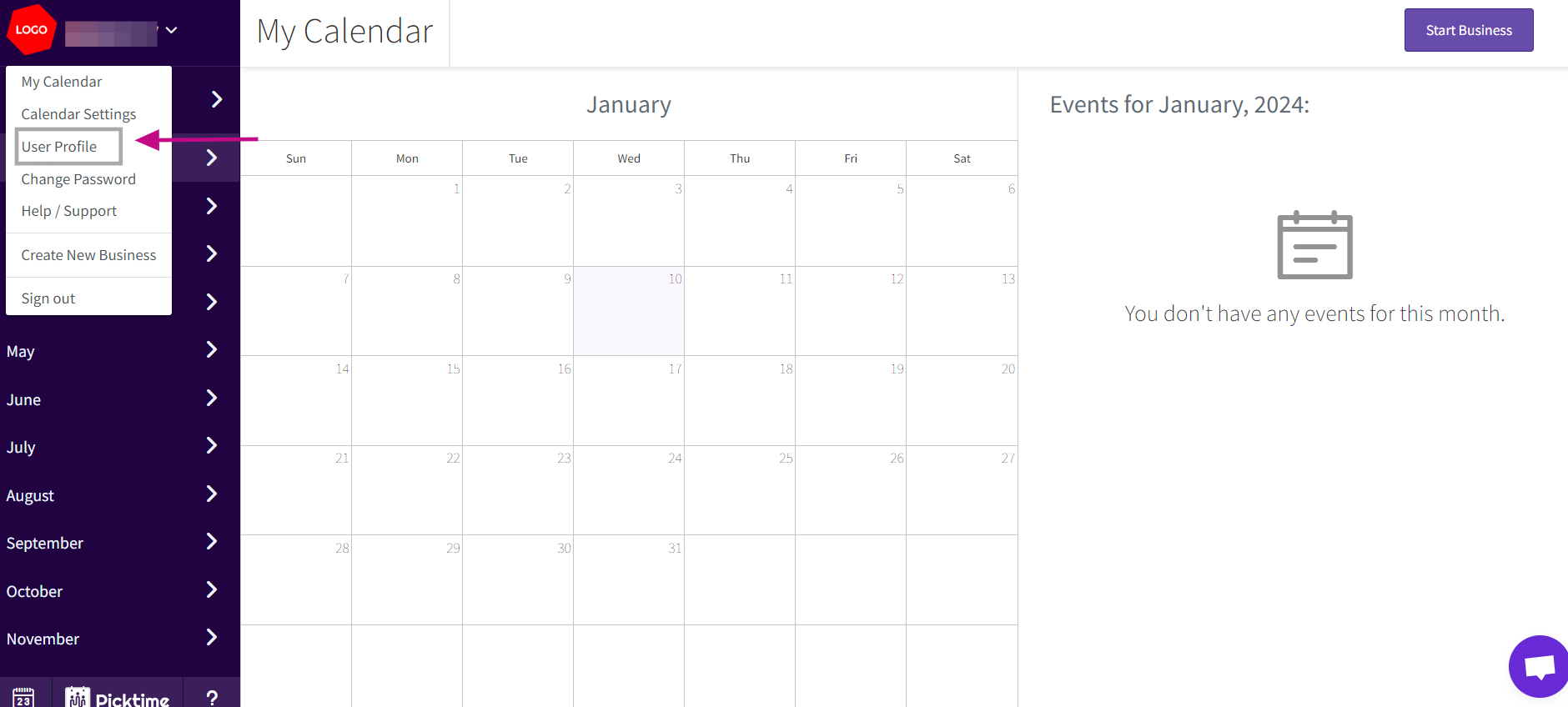 Go to the Picktime website and log in to your personal account using your current email address and password. After logging in, click on the drop-down arrow next to your name, usually located in the top left corner of the page.