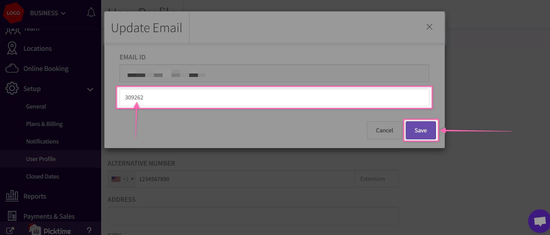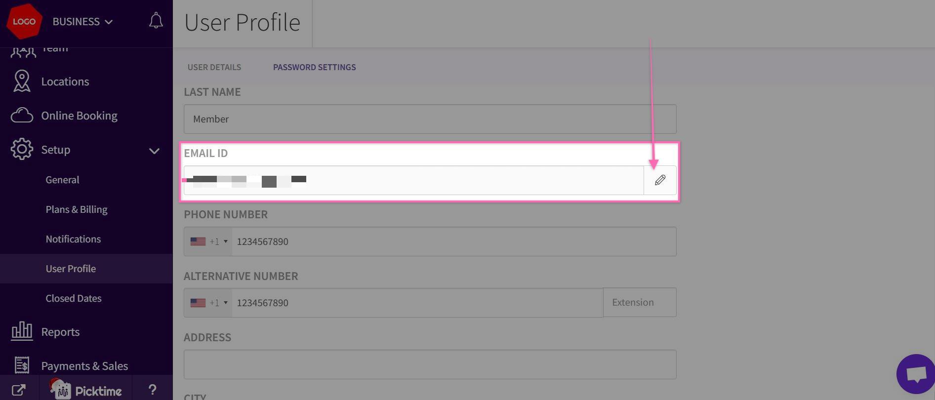 - Once in the User Profile section, identify the 'EMAIL ID' field. Click on edit ( pencil icon ). In the EMAIL ID field, input the new email address that you want to update. Ensure that this email is not already registered as an Admin, Team member, or customer in any Picktime business.