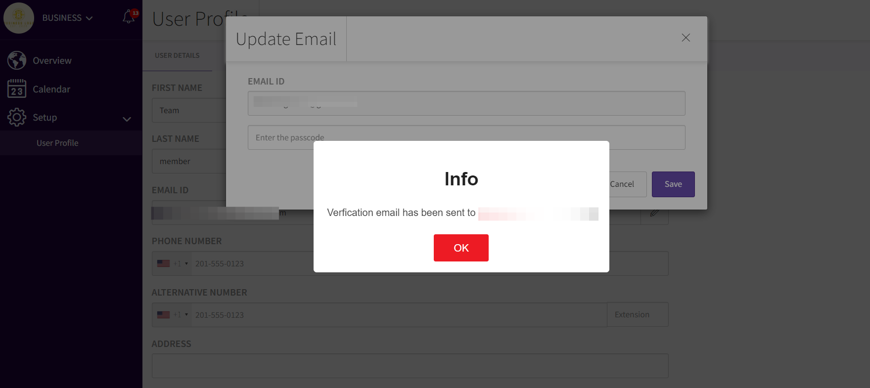 - Once the email address is successfully verified, Picktime will automatically update it across all associated businesses and within the Team list.